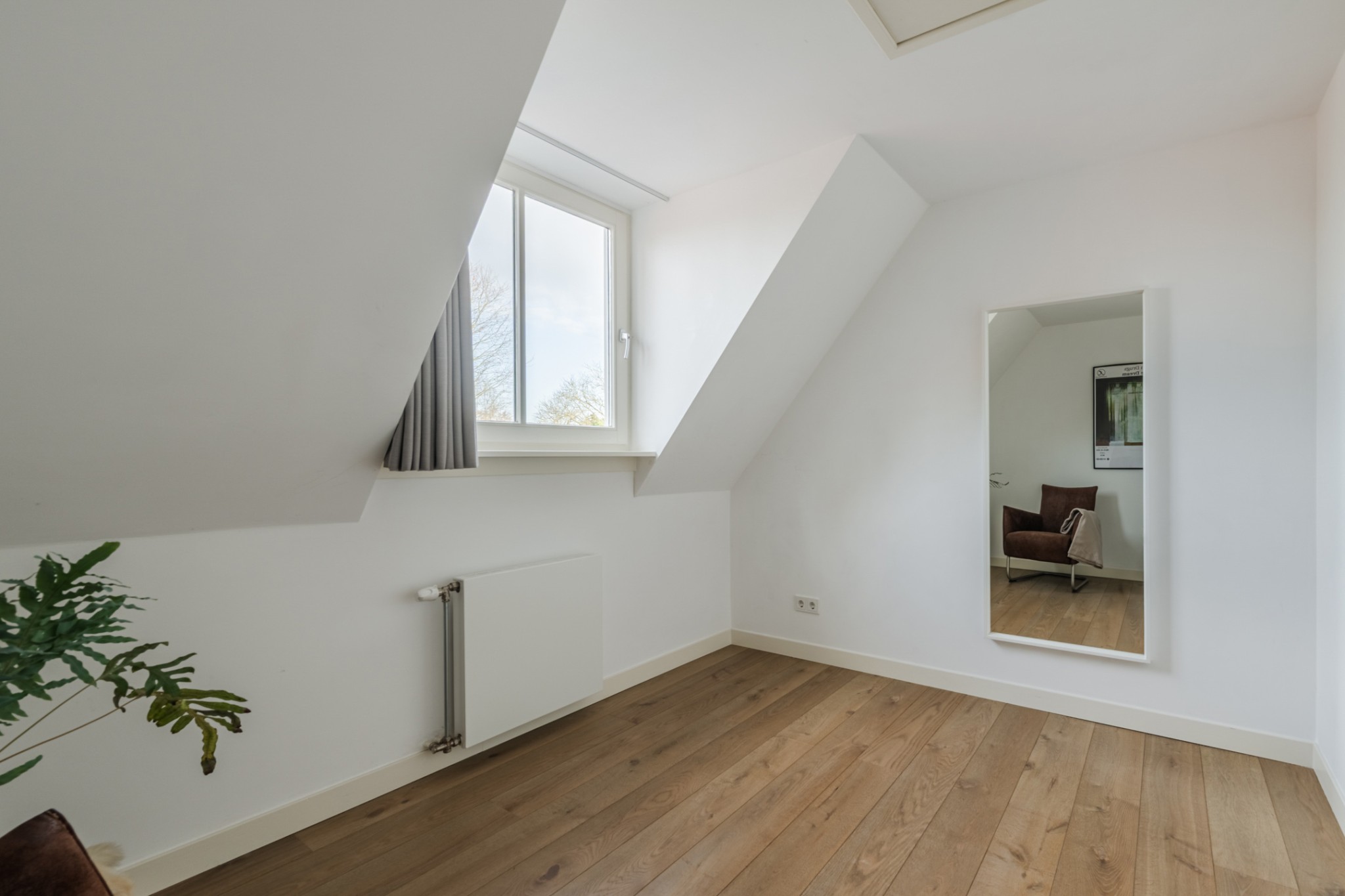 Slaapkamer, ± 8 m², met houten vloerdelen en dakkapel.
