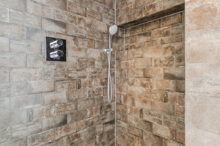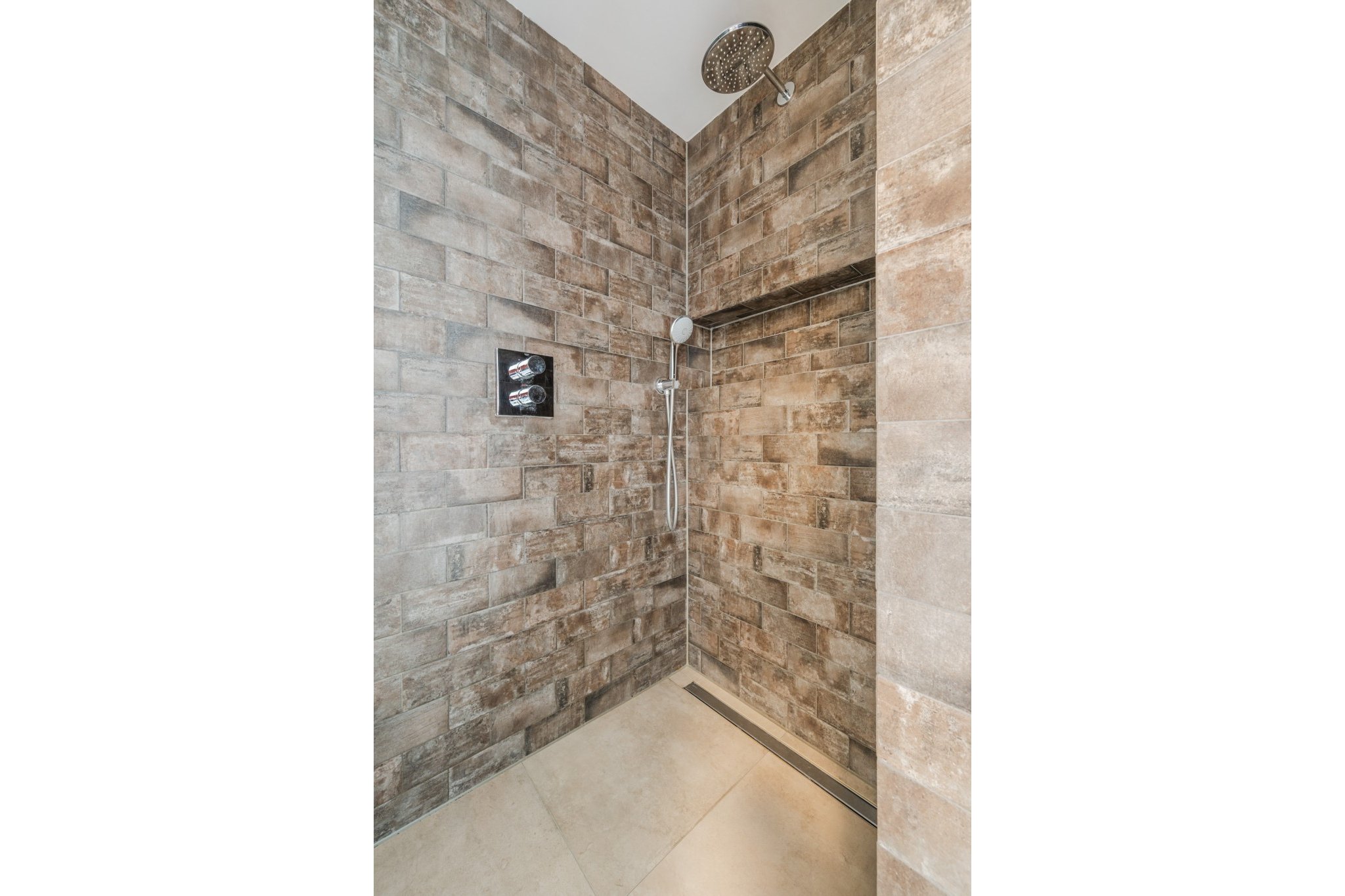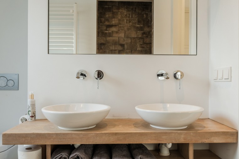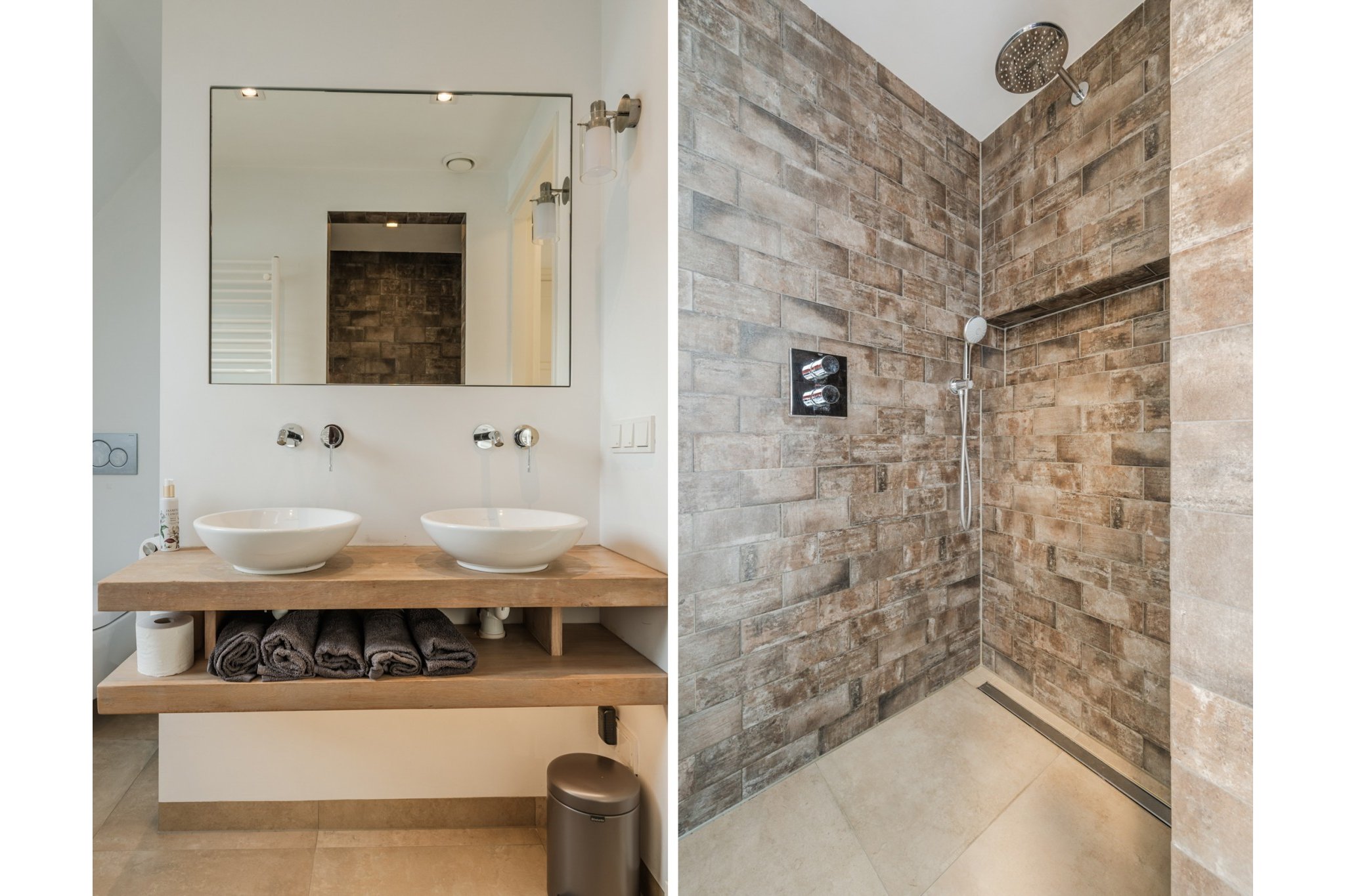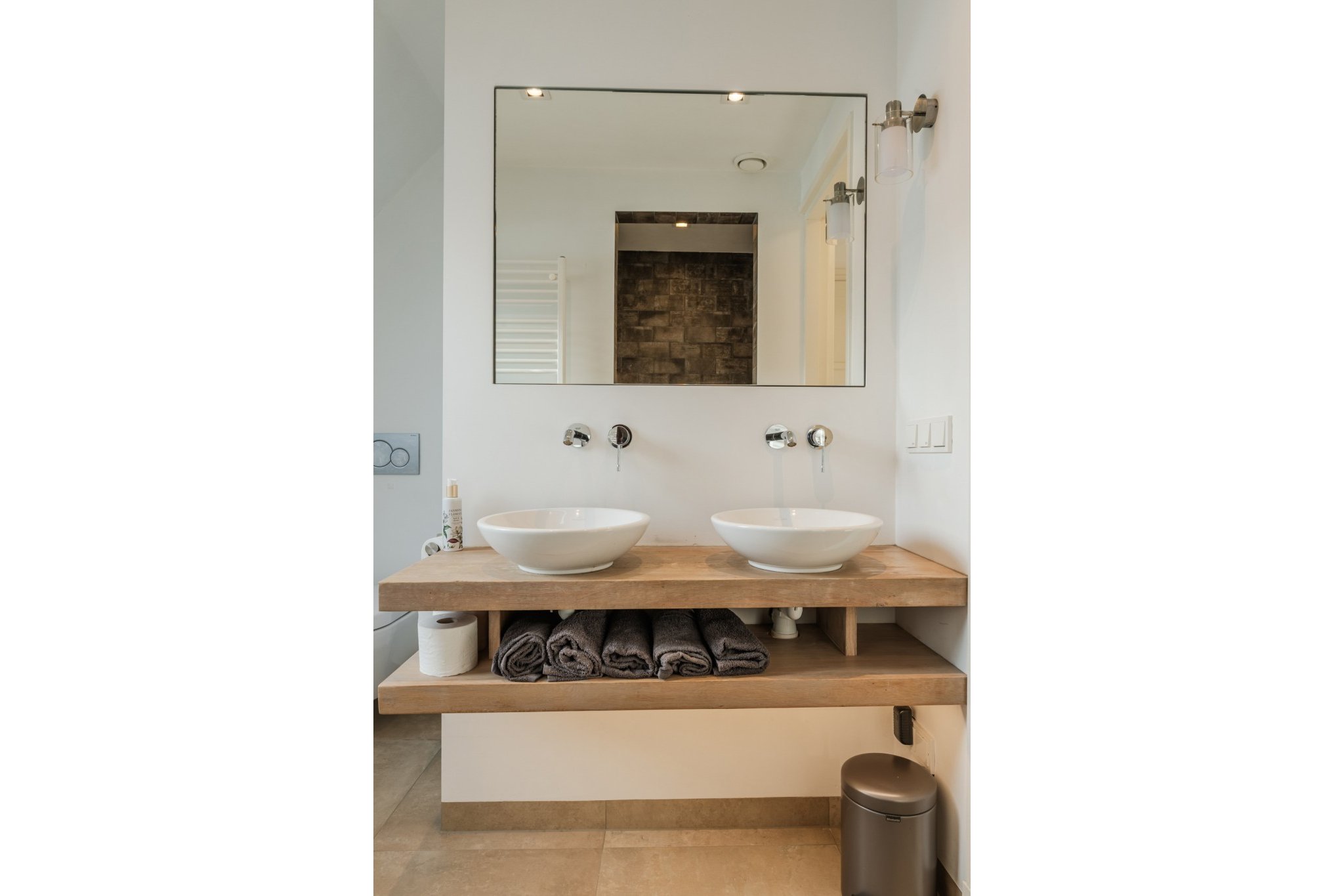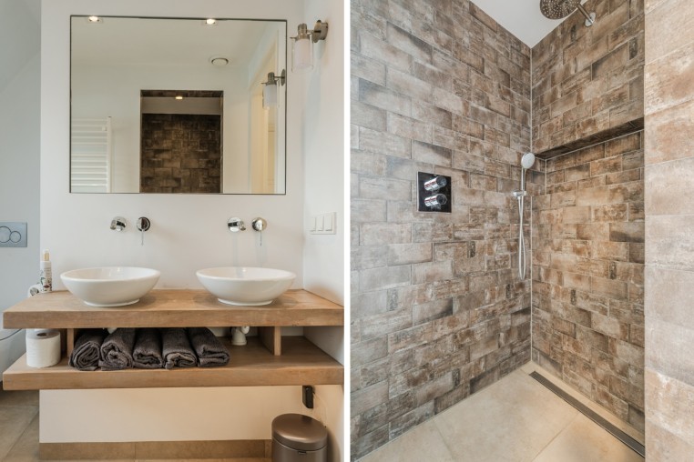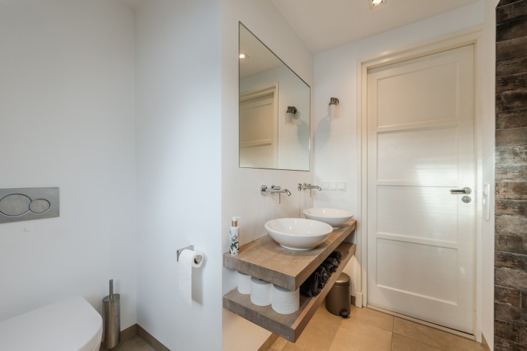 Moderne, luxe badkamer voorzien van tegelvloer met vloerverwarming, strakke stucwerk wanden en -plafond, mechanische ventilatie, tot plafond betegelde inloopdouche, badmeubel met 2 wastafels en 2e toilet.