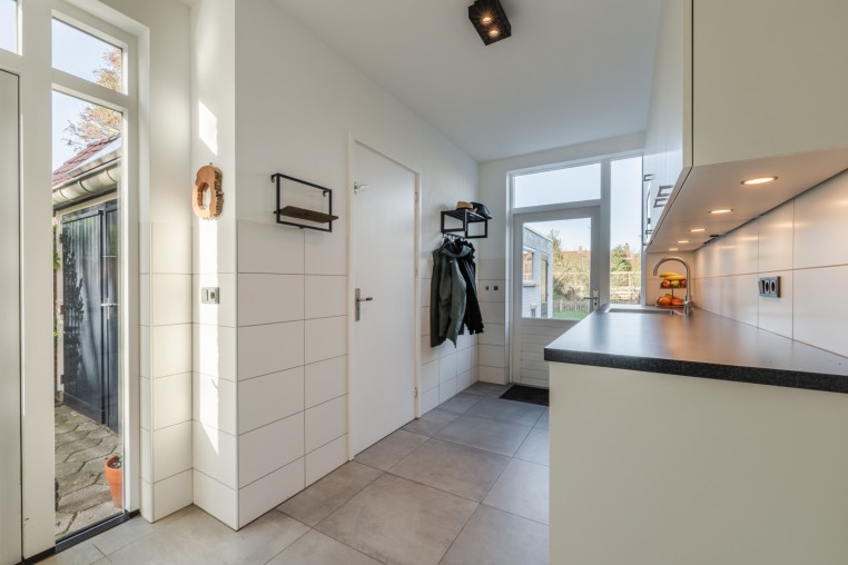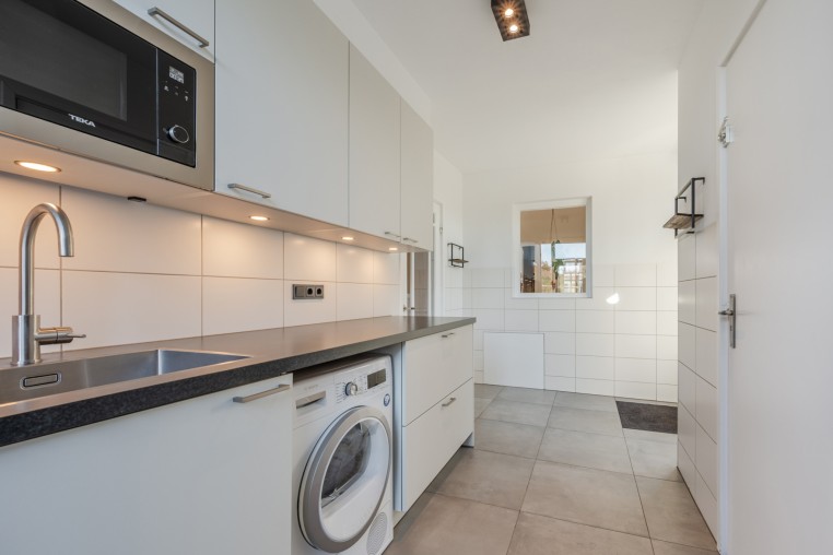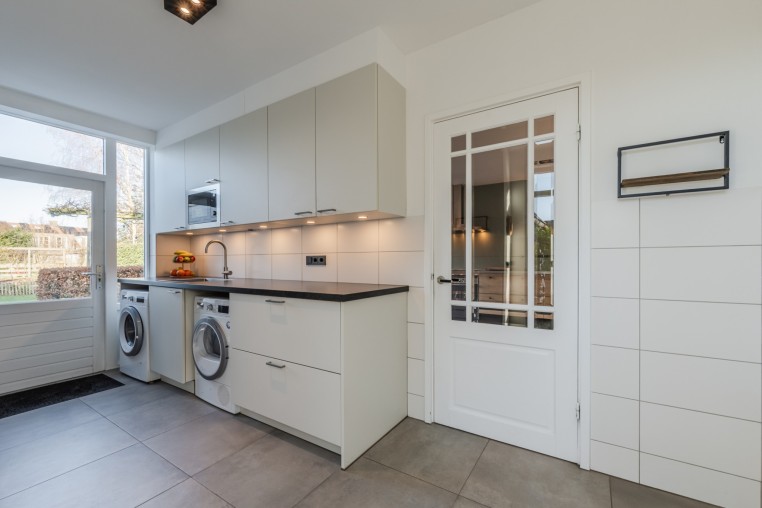 Praktische bijkeuken, ± 10 m², voorzien van tegelvloer met vloerverwarming en aansluitingen wasapparatuur, keukenblok met diverse onder- en bovenkasten, spoelbak en magnetron. Vanuit de bijkeuken is de tuin, garage en oprit bereikbaar.