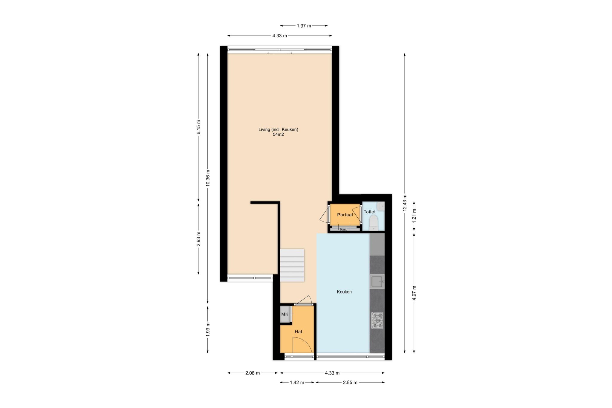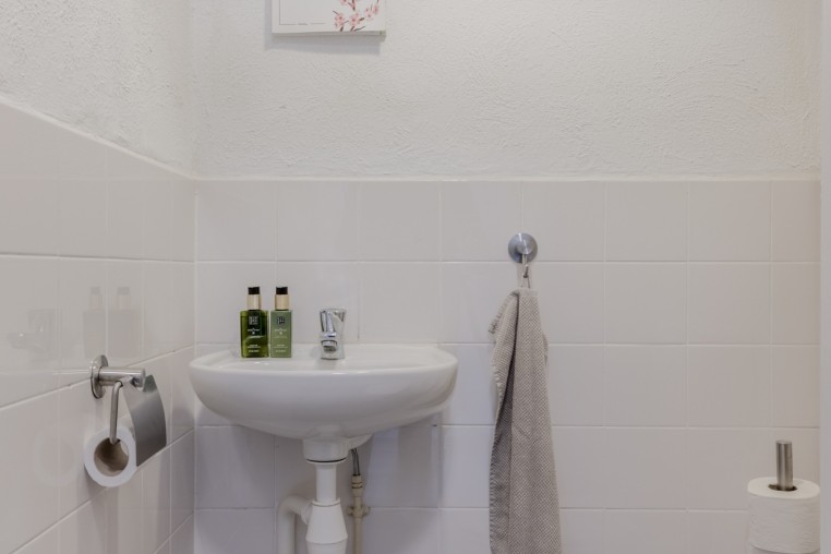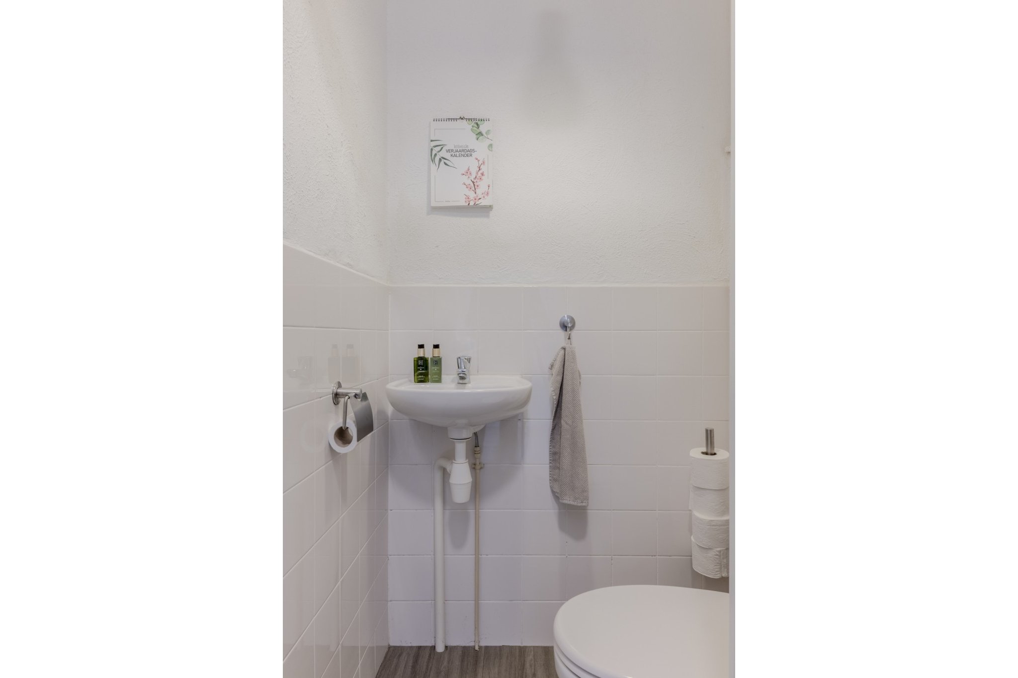 Portaal met toegang tot toiletruimte met toilet en fonteintje.
