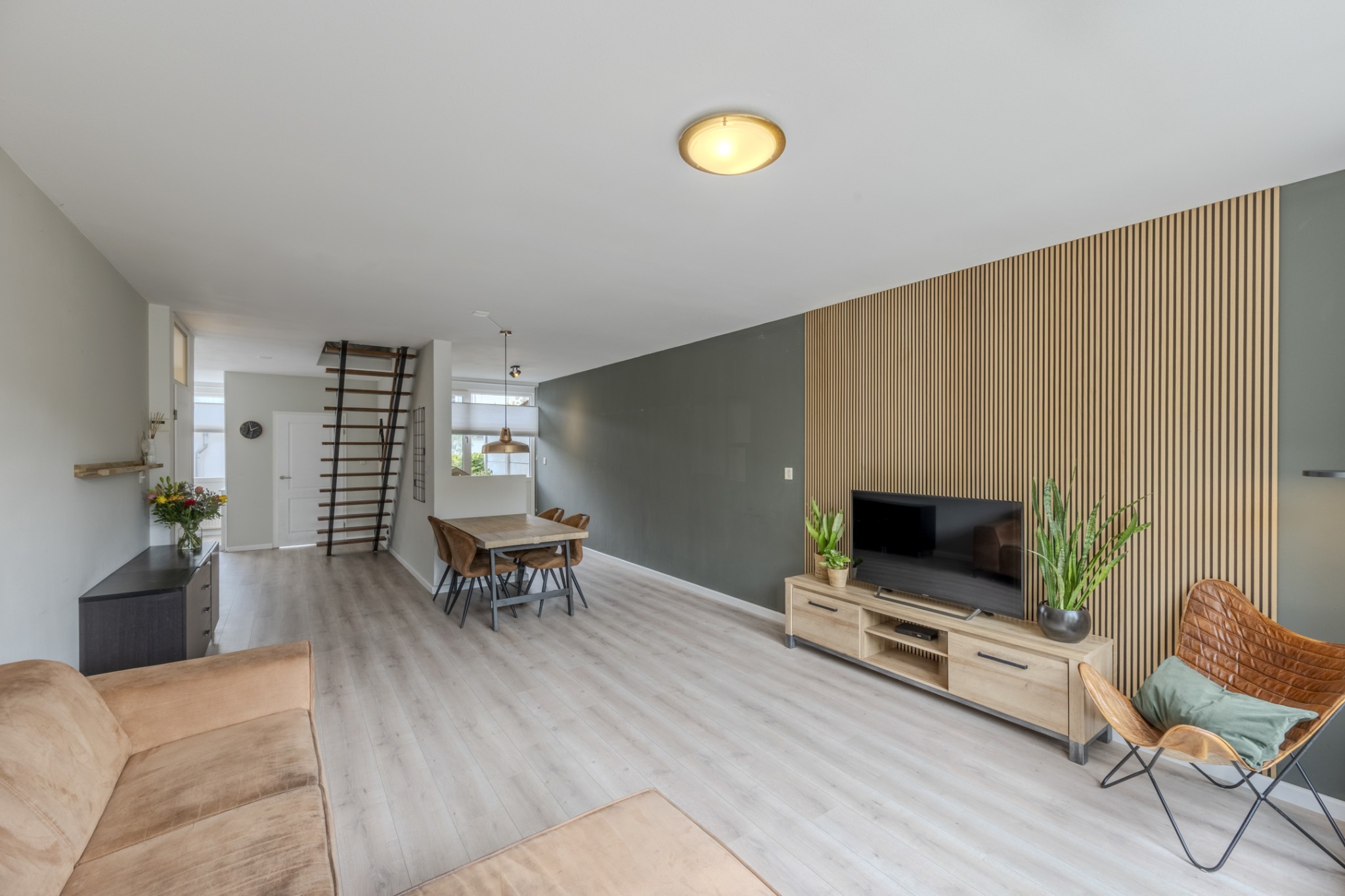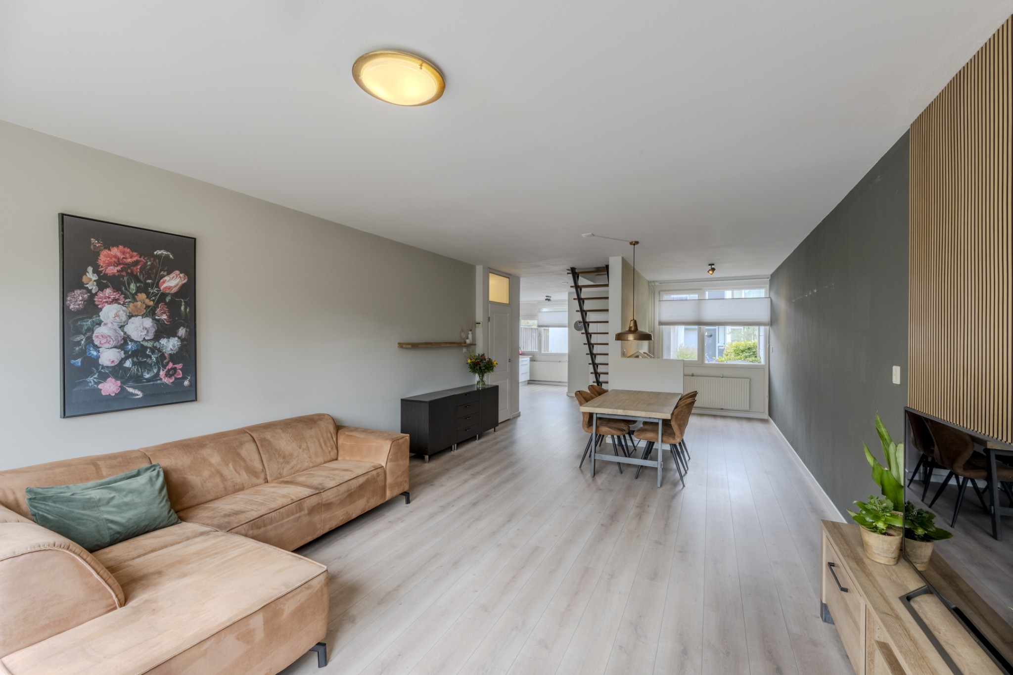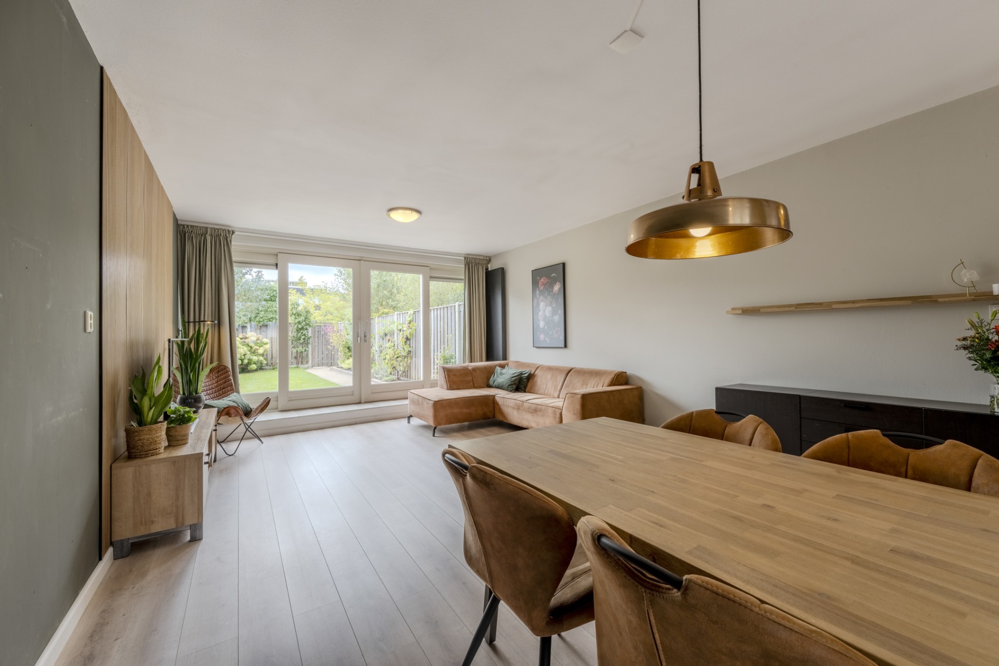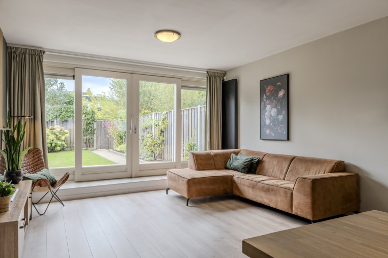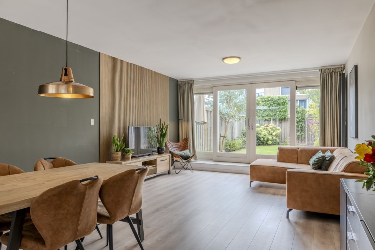 Royale living, ± 54 m² (incl. keuken), voorzien van laminaatvloer en grote schuifpui naar de fraai aangelegde achtertuin.