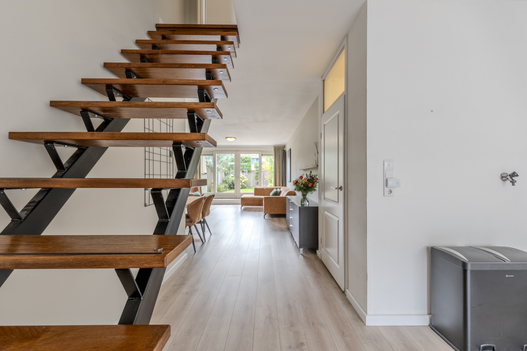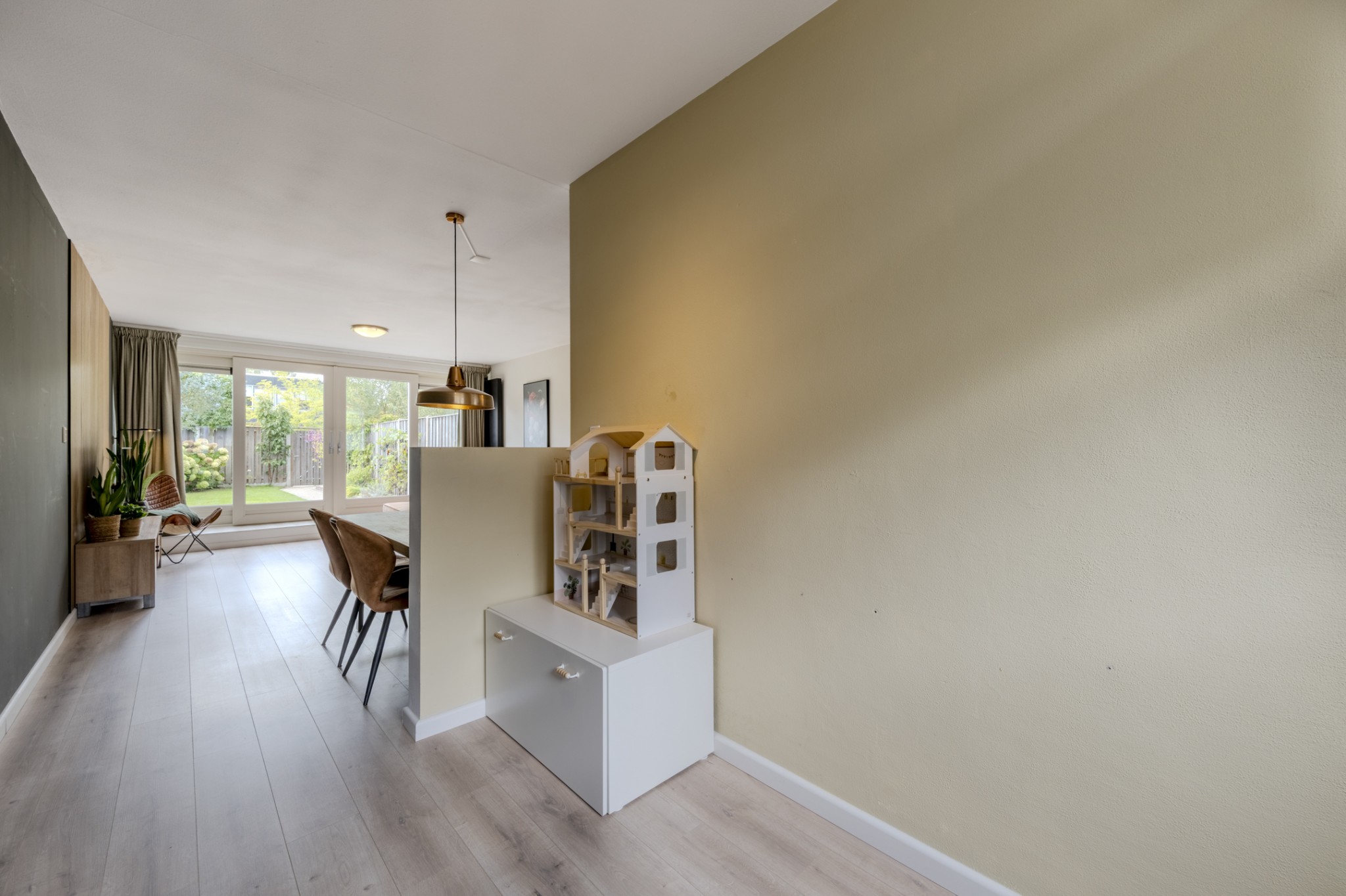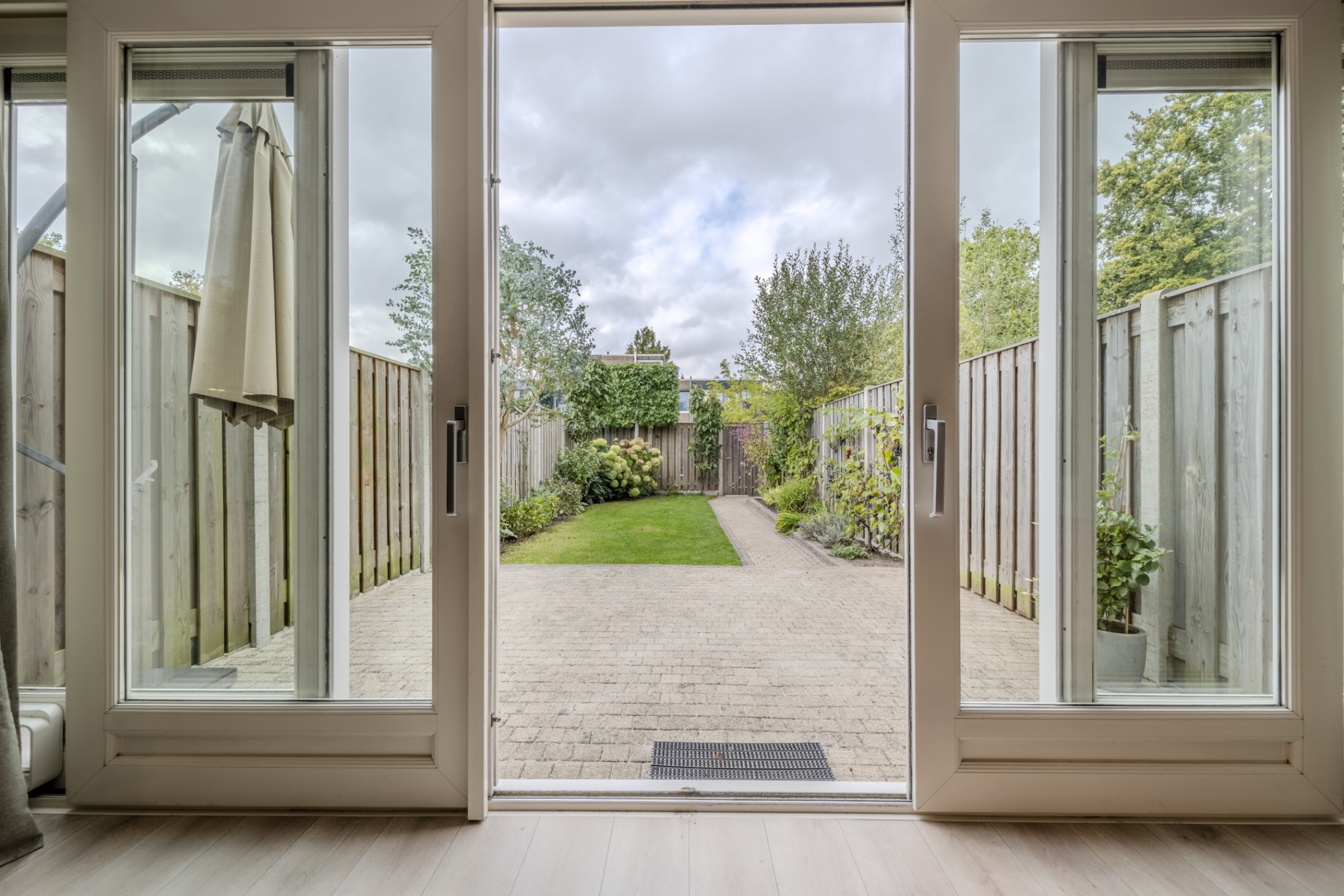 Royale living, ± 54 m² (incl. keuken), voorzien van laminaatvloer en grote schuifpui naar de fraai aangelegde achtertuin.