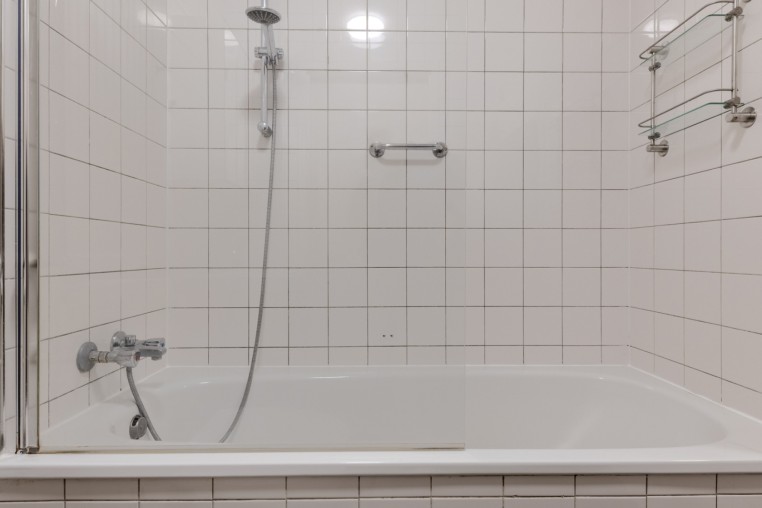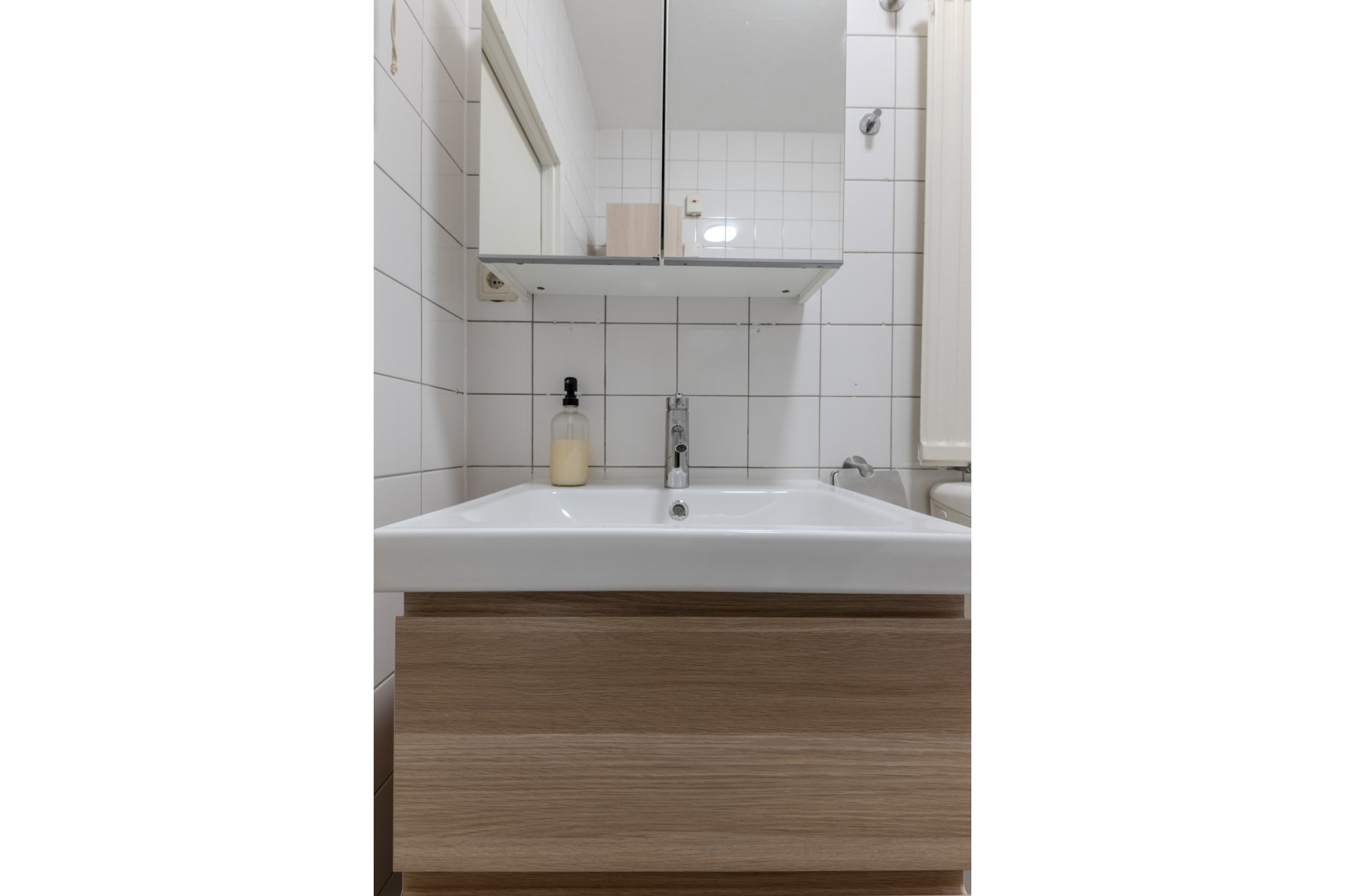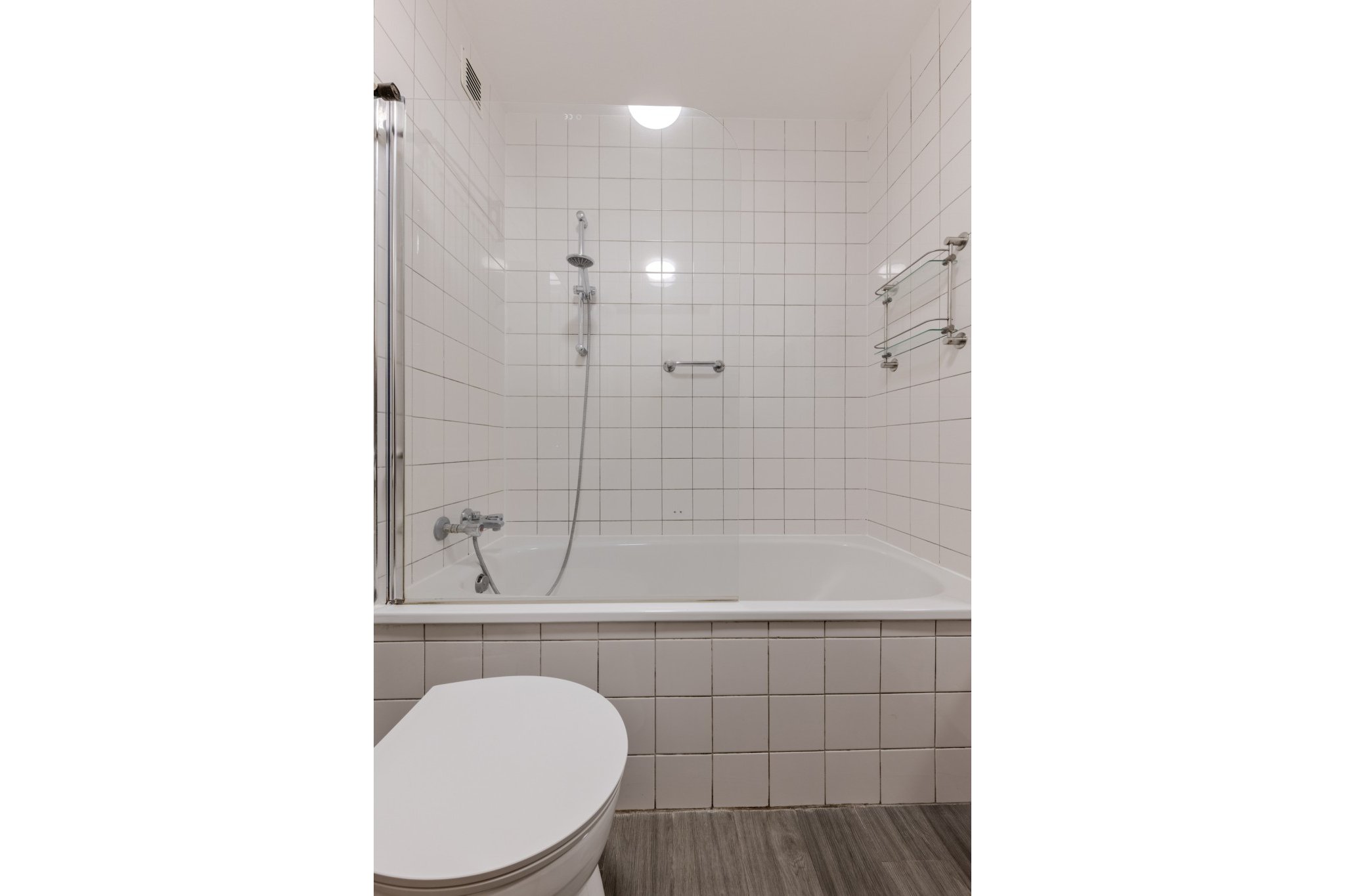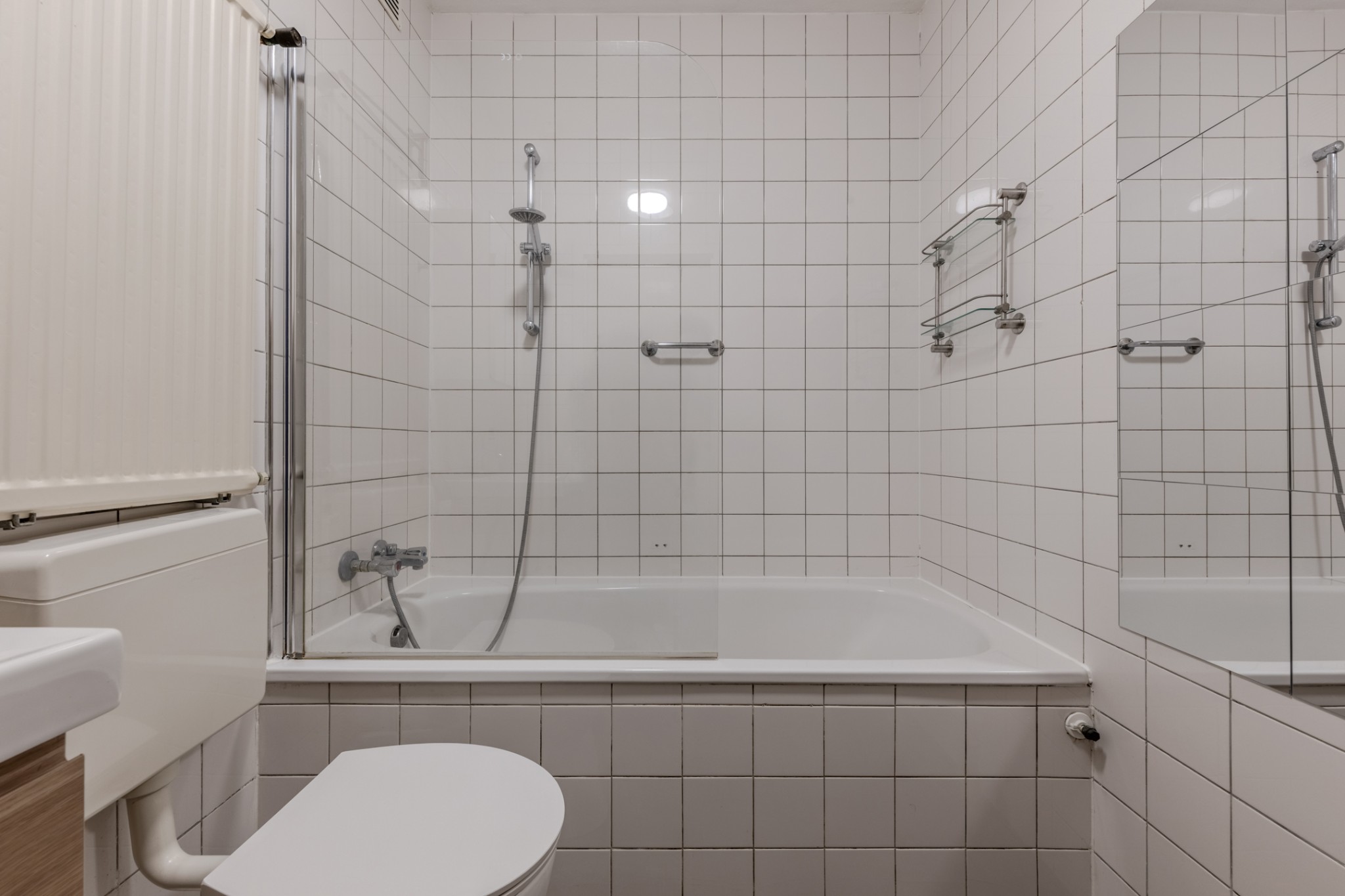 Geheel betegelde badkamer met ligbad, badmeubel met wastafel en toilet.