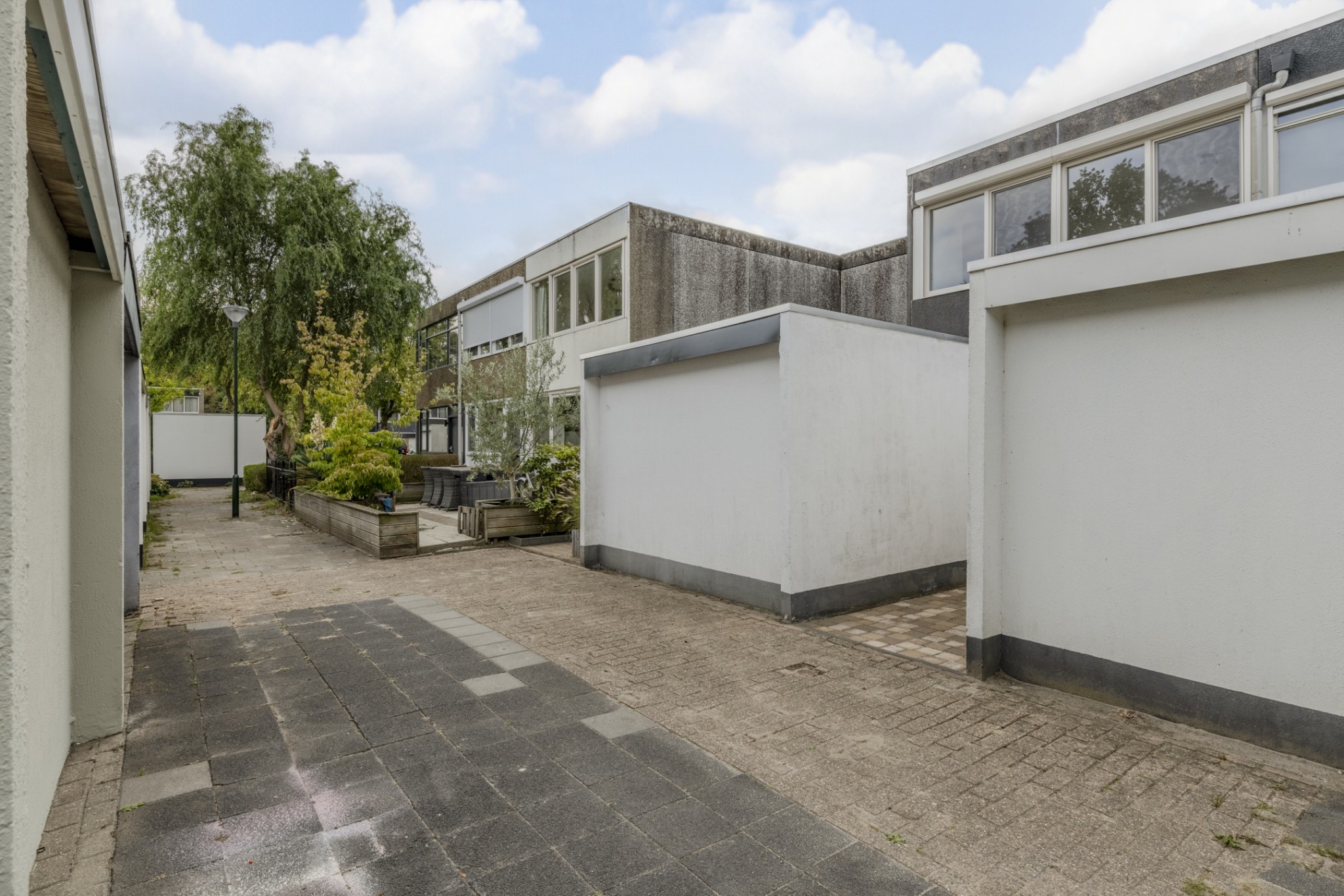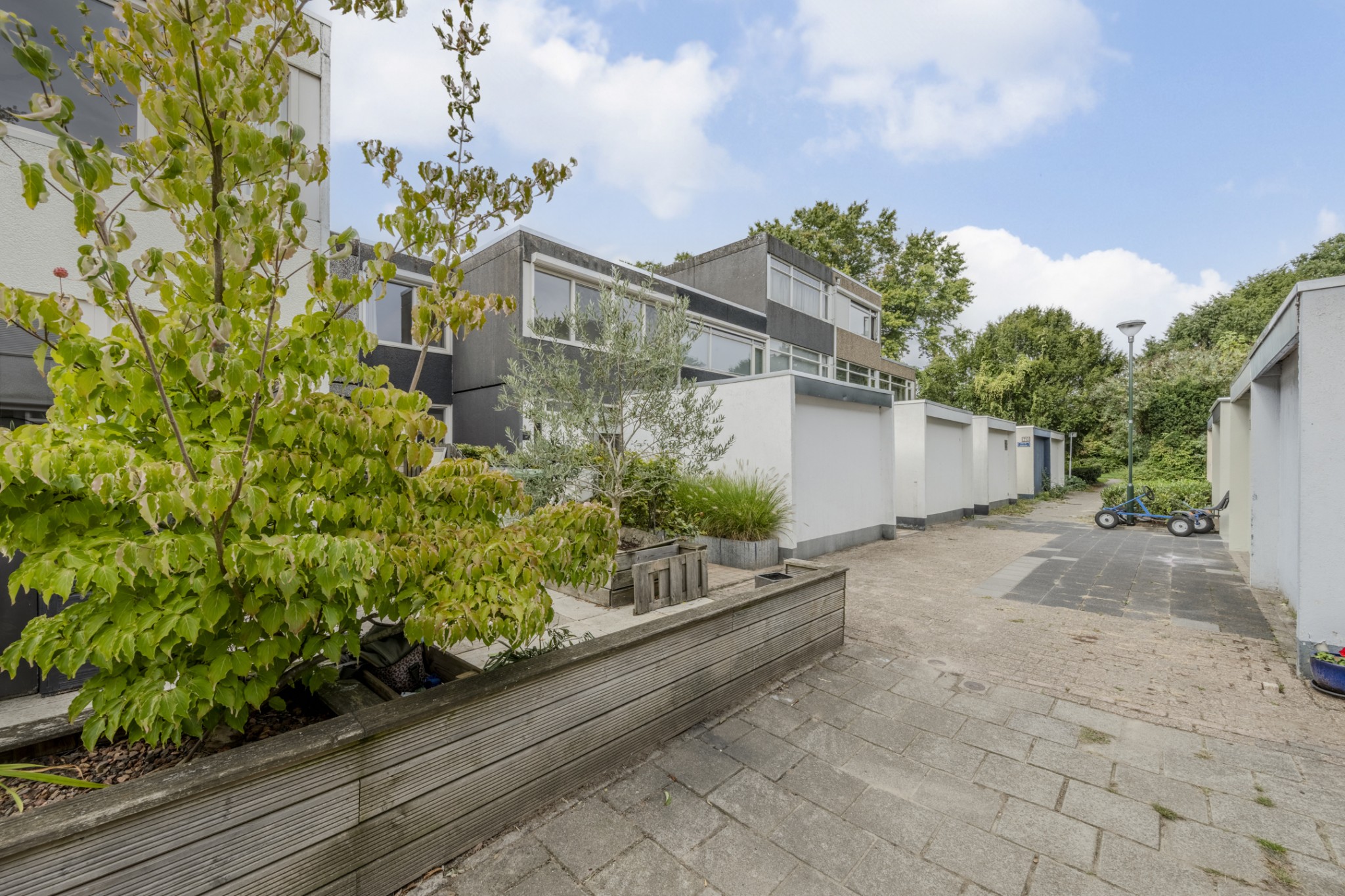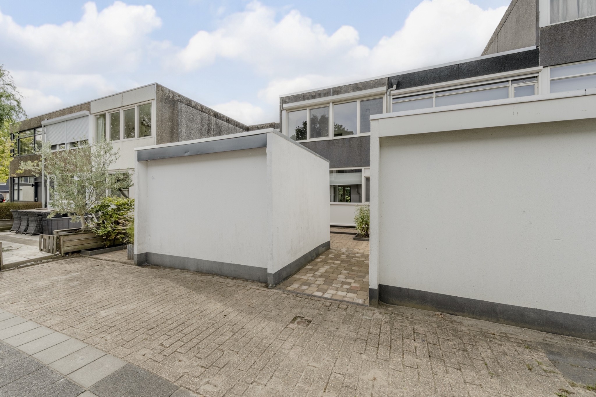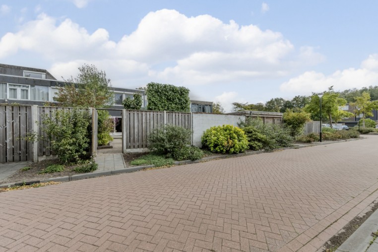Keurige, betegelde voortuin met ruime berging, ± 8 m².