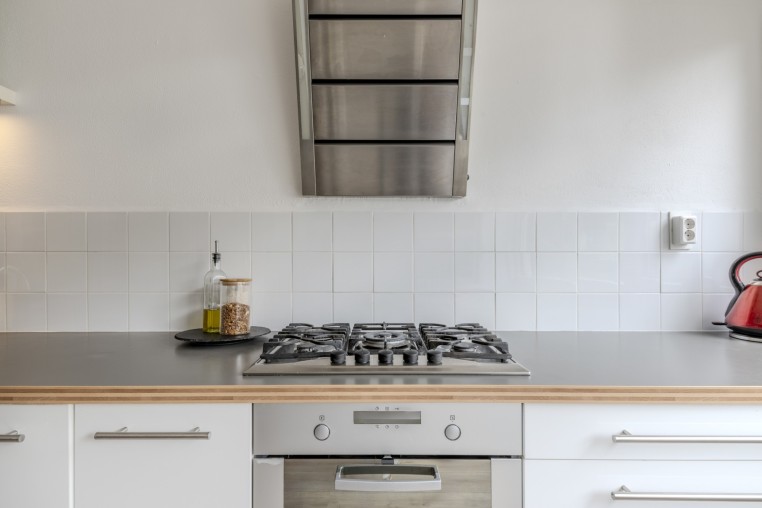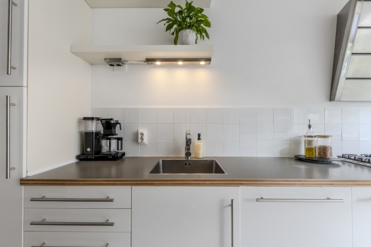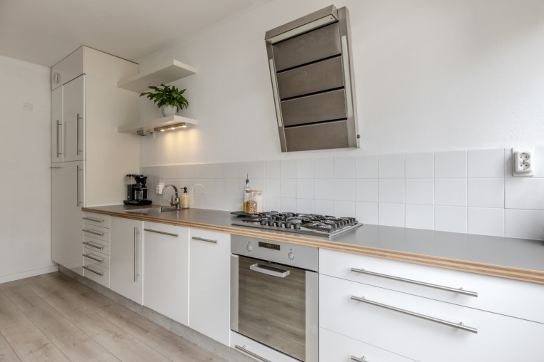Open keuken met laminaatvloer, moderne inrichting met diverse laden en kasten, buffetkast en inbouwapparatuur, t.w.: 5-pits gaskookplaat, oven, koelkast en vaatwasser.
